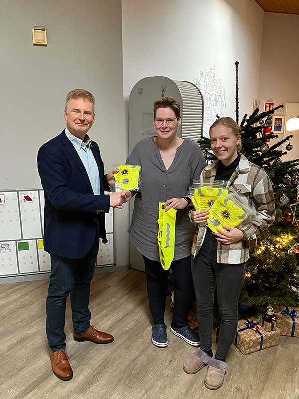 Unter anderem durfte sich die St. Töniser Kindertagesstätte „Freijowaldi“ über eine Spende freuen. Die Einrichtung, die vom Deutschen Roten Kreuz getragen wird, erhielt insgesamt dreißig Warnwesten, die künftig bei außerhäusigen Aktivitäten zum Einsatz kommen. Die pädagogische Leitungsfachkraft Frau Pia Bungard sowie die Auszubildende zur Kinderpflegerin, Frau Ashlee Müller, nahmen die Westen stellvertretend für die Kinder der Einrichtung dankbar entgegen.